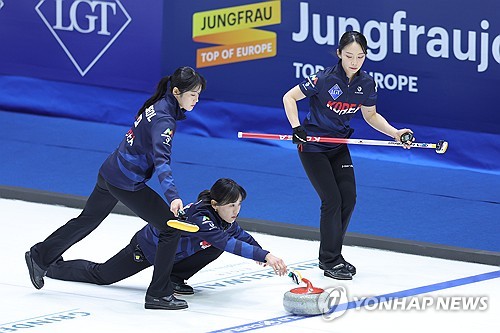 (서울=연합뉴스) 설하은 기자 = 여자 컬링 국가대표 경기도청(스킵 김은지, 서드 김민지, 세컨드 김민지, 리드 설예은, 핍스 설예지)이 안방에서 열린 세계선수권대회에서 강호 스위스에 져 첫 패배를 당했다.