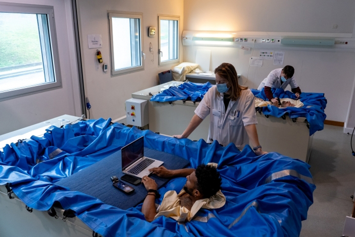 무중력 상태가 인체에 미치는 영향을 실험하기 위해 머리와 팔을 빼고 물 속에서 열흘 간 생활한 참가자. 유럽우주국(ESA) 제공 |