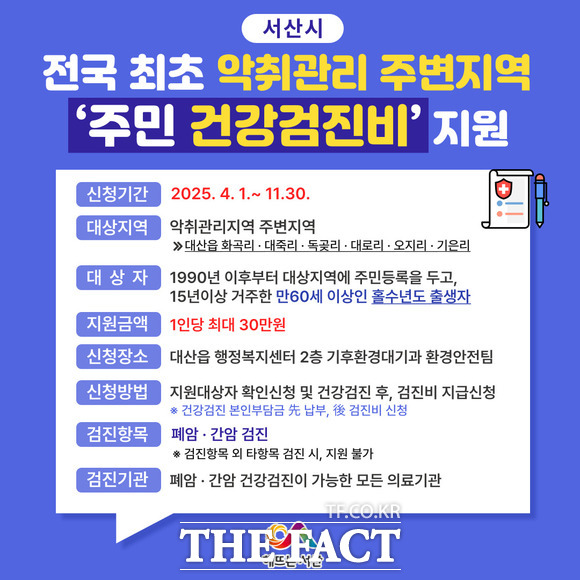 [더팩트ㅣ서산=이수홍 기자] 충남 서산시가 전국 최초로 악취관리지역 주변에 거주하는 60세 이상 주민을 대상으로 건강검진비 지원에 나선다고 19일 밝혔다.