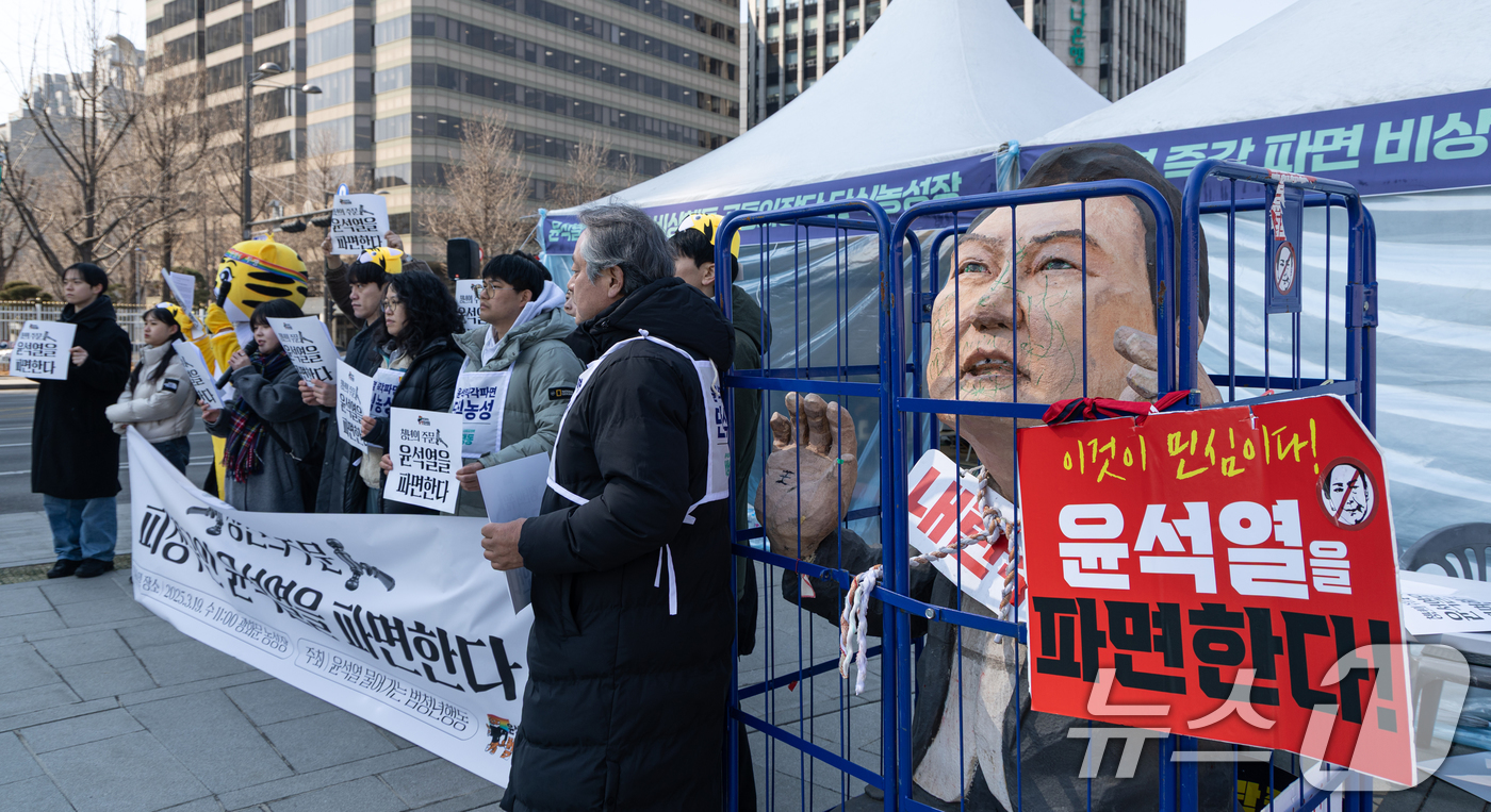 (서울=뉴스1) 이승배 기자 = '윤석열 물어가는 범청년행동' 구성원들이 19일 오전 서울 종로구 경복궁역 인근에서 기자회견을 열고 윤석열 대통령 탄핵을 촉구하고 있다. 2025.3.19/뉴스1