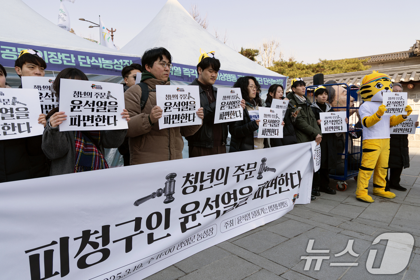 (서울=뉴스1) 이승배 기자 = '윤석열 물어가는 범청년행동' 구성원들이 19일 오전 서울 종로구 경복궁역 인근에서 기자회견을 열고 윤석열 대통령 탄핵을 촉구하고 있다. 2025.3.19/뉴스1