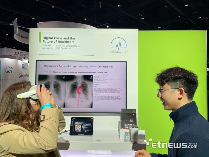 이번 행사에서 메디컬아이피는 지난해 소개한 '옴니버스'플랫폼과 연동된 의료영상 분석 솔루션 '메딥프로' 외에도 엔비디아의 고성능 GPU 연산 기술을 활용한 '딥캐치엑스'의 비전프로 연동 버전을 공개했다. 개인의 엑스레이 데이터를 바탕으로 비전프로를 착용하면 3D 대동맥을 공중에서 입체적으로 확인할 수 있는 기술을 최초로 선보였다.