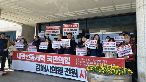 (김해=연합뉴스) 최병길 기자 = 경남 김해지역 시민사회·노동단체가 모인 '윤석열 퇴진 김해시민연대'는 19일 시의회 앞에서 기자회견을 열고 최근 국민의힘 시의원들이 윤석열 대통령에 대한 탄핵 각하 촉구 결의안을 기습 채택한 것을 비판했다.