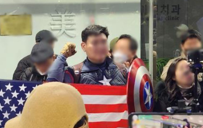 '캡틴 아메리카' 복장을 한 윤석열 대통령 지지자. 연합뉴스 |