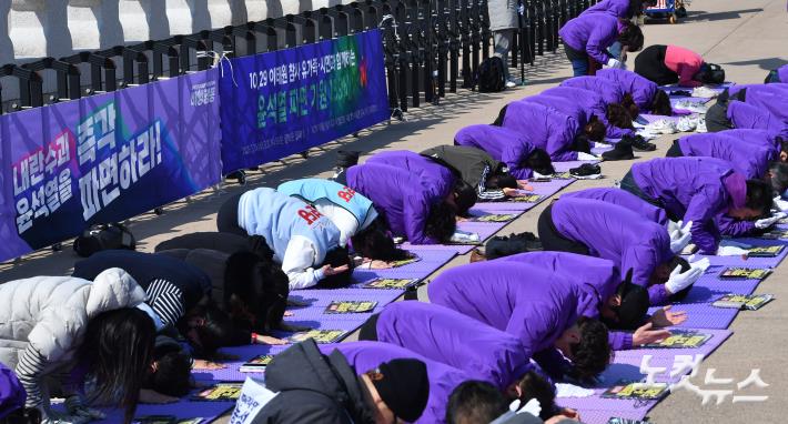 10.29 이태원참사 유가족협의회·시민대책회의 관계자들이 19일 오후 서울 종로구 광화문 월대 인근에서 윤석열 대통령 파면 기원 159배를 하고 있다.