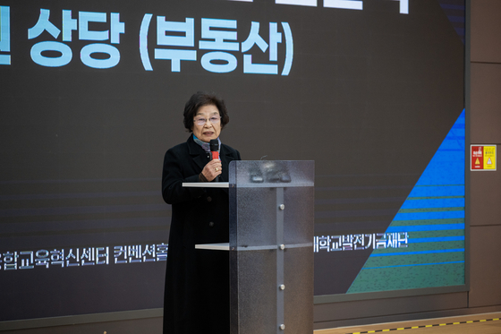부산에 거주하는 윤근(88) 여사가 충남대에 40억 상당 발전기금을 기탁했다. 윤 여사가 이날 발전기금 전달식을 마치고 인사말을 하고 있다. 사진 충남대 |