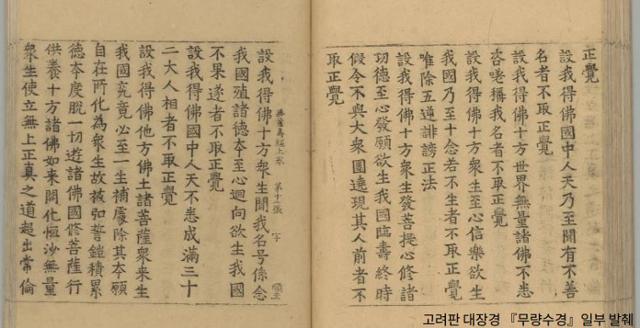 고려 시대에 목판으로 제작·인쇄된 불교 경전인 ‘무량수전’의 일부이다. 일본 문부과학성이 유네스코 세계기록유산 등재를 신청한 '사찰 조조지 소장 3종 불교 성전 총서’에 포함돼 있다. 한국일보 자료사진 |