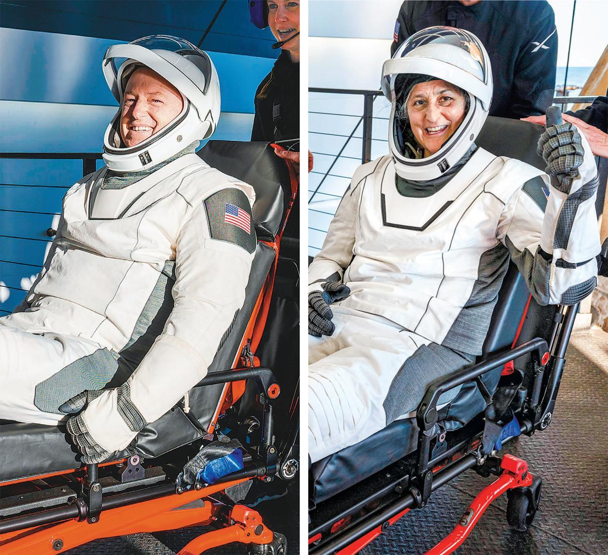 18일 미국의 민간항공사 ‘스페이스X’의 우주캡슐 ‘드래건’을 타고 플로리다주 탤러해시 앞바다에 착수한 미 항공우주국(NASA) 우주비행사 부치 윌모어(왼쪽 사진)와 수니 윌리엄스(오른쪽 사진)가 구조선에 인양되는 모습. 지난해 6월 5일 보잉의 우주캡슐 ‘스타라이너’를 타고 국제우주정거장(ISS)으로 8일짜리 시험비행을 갔던 이들은 기체 결함 등으로 귀환이 늦어져 286일 만에 지구에 돌아왔다.