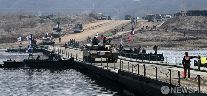 [연천=뉴스핌] 사진공동취재단 = 20일 경기 연천군 임진강 일대 석은소 훈련장에서 열린 한미 연합 제병협동 도하훈련에서 K1E1전차가 180m 길이의 연합부교를 건너고 있다. 2025년 전반기 한미 연합연습의 일환으로 실시된 이번 훈련에는 국군 5·7공병여단과 미2사단, 한미연합사단 등 총 600여 명의 장병이 참가했다. 2025.03.20 photo@newspim.com