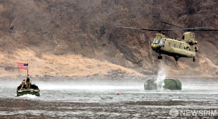[연천=뉴스핌] 사진공동취재단 = 20일 경기 연천군 임진강 일대 석은소 훈련장에서 열린 한미 연합 제병협동 도하훈련에서 치누크가 도하자산을 수송하고 있다. 2025.03.20 photo@newspim.com