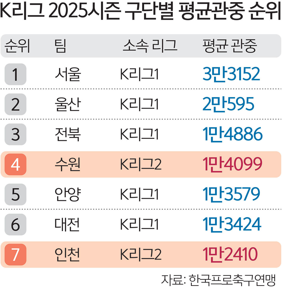 2025시즌 28경기를 치른 K리그2에 유료관중 13만6167명이 몰렸다. 경기당 평균 관중은 4863명으로 역대 최다다. K리그2 관중은 매 시즌 급격한 성장세를 기록 중이다. 최근 3년 새 평균관중 증가율은 105.5%로 두 배 이상 늘었을 정도다.