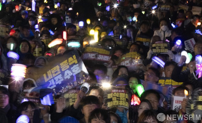 [서울=뉴스핌] 최지환 기자 = 20일 오후 서울 종로구 동십자각 앞에서 열린 '내란수괴 윤석열 즉각 파면 긴급행동'에서 윤 대통령 탄핵에 찬성하는 시민들이 응원봉을 흔들고 있다. 2025.03.20 choipix16@newspim.com