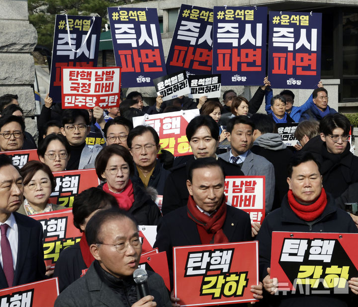 더불어민주당은 윤 대통령에 대한 파면 선고를 촉구하며 "헌재가 정치적 주장에 흔들리고 있다", "선고가 다음 주를 넘겨선 안 된다"고 주장했다.