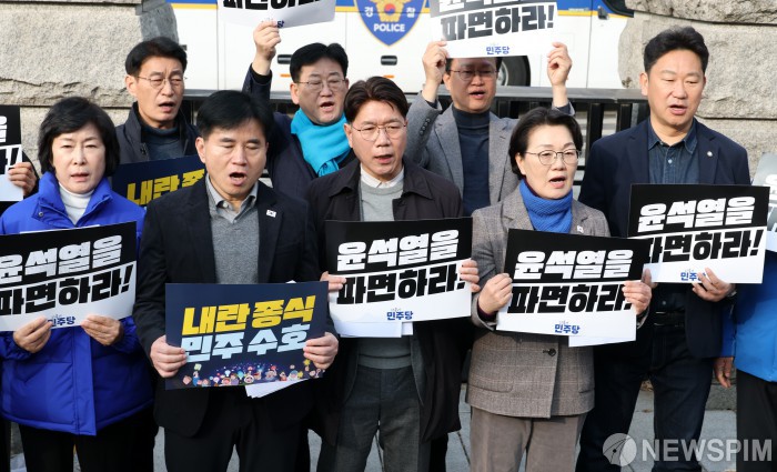 [서울=뉴스핌] 정일구 기자 = 더불어민주당 국회 산업통상자원중소벤처기업위원회, 농림축산식품해양수산위원회 위원들이 21일 오전 서울 종로구 헌법재판소 앞에서 윤석열 대통령 즉각 파면 촉구 기자회견을 하고 있다. 2025.03.21 mironj19@newspim.com
