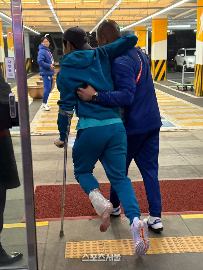 축구대표팀 이강인이 20일 고양종합운동장에서 열린 오만과의 2026 북중미월드컵 아시아 지역 3차 예선 7차전 경기를 마친 뒤 스태프의 도움을 받아 경기장을 빠져나가고 있다.고양 | 정다워 기자 |