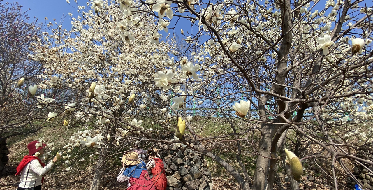 지난 21일 오후 경남 김해시 흥동 김해평야 옆 하얀 목련 군락지 명소인 ‘김해시민의숲’에 봄나들이객들의 발길이 이어지고 있다. [연합뉴스] |