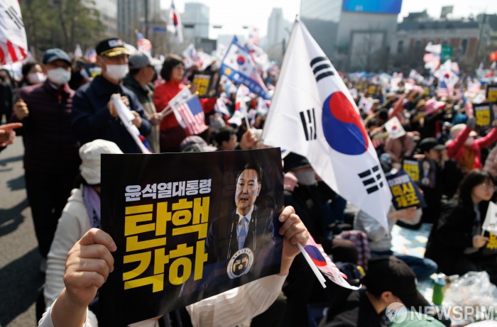 [서울=뉴스핌] 윤창빈 기자 = 22일 오후 서울 여의도 광화문역 인근에서 자유통일당 등 주최로 윤석열 대통령 탄핵 반대 집회가 열리고 있다. 2025.03.22 pangbin@newspim.com