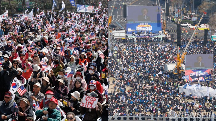[서울=뉴스핌] 윤창빈 기자 = 22일 서울 종로구 광화문광장 인근에서 윤석열 대통령 탄핵 반대 집회(왼쪽)와 탄핵 찬성 집회가 열리고 있다. 2025.03.22 pangbin@newspim.com |