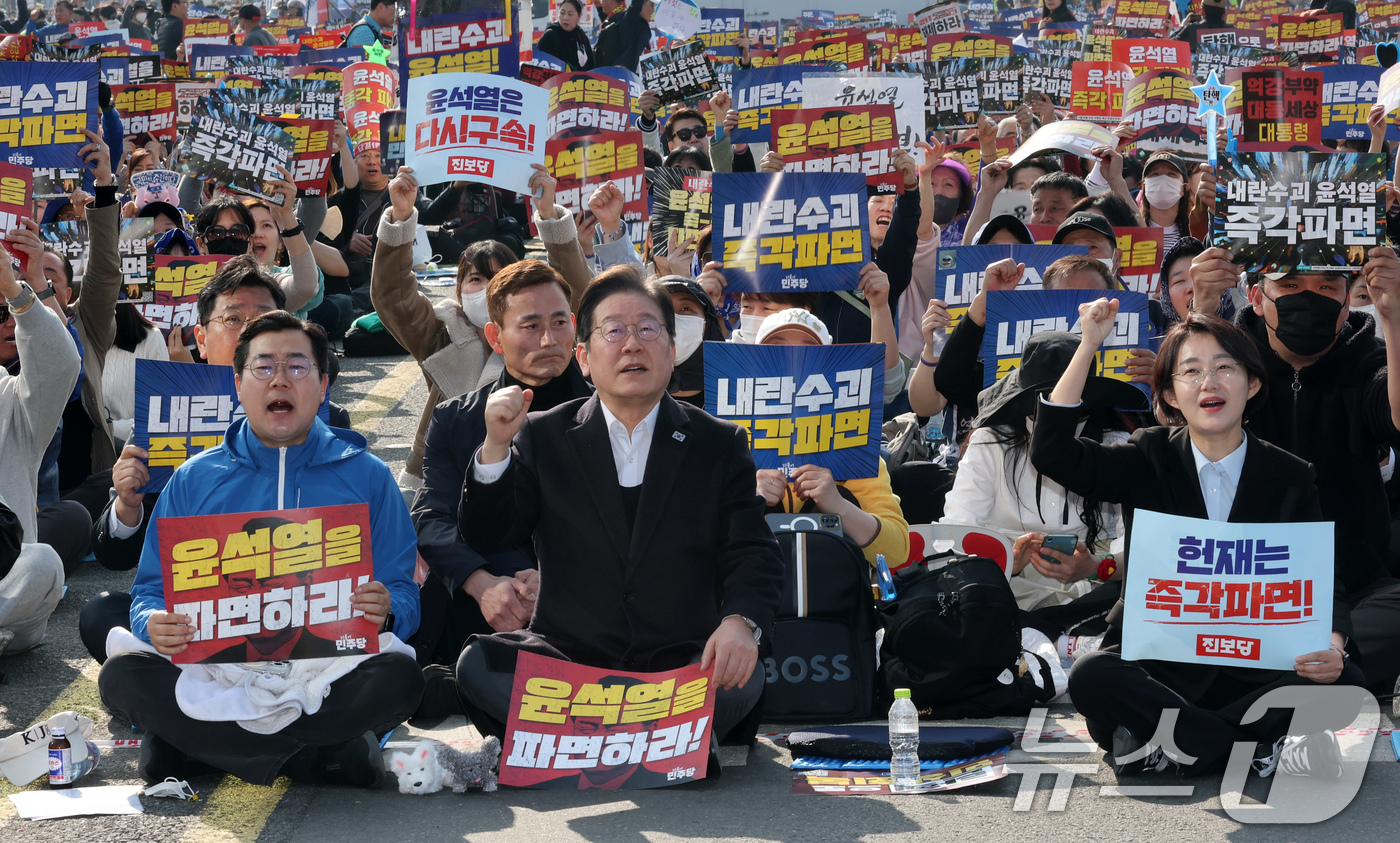 (서울=뉴스1) 박세연 기자 = 이재명 더불어민주당 대표와 박찬대 원내대표가 22일 서울 광화문 앞에서 열린 야5당 공동 비상시국 대응을 위한 범국민대회에 참석해 윤석열 대통령 탄핵을 촉구하는 구호를 외치고 있다. 2025.3.22/뉴스1