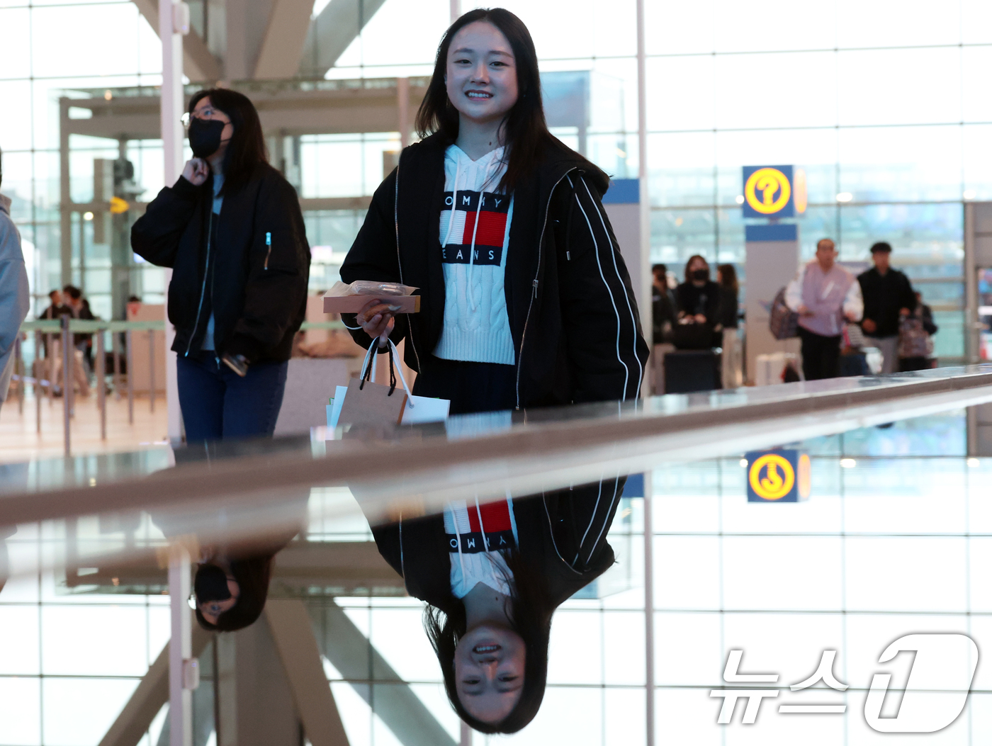 (인천=뉴스1) 김명섭 기자 = 김채연 대한민국 여자 싱글 피겨 스케이팅 국가대표가 23일 오전 인천국제공항에서 오는 25일(현지 시각) 미국 보스턴에서 개막하는 세계선수권 대회에 참가하기 위해 출국하고 있다. 2025.3.23/뉴스1