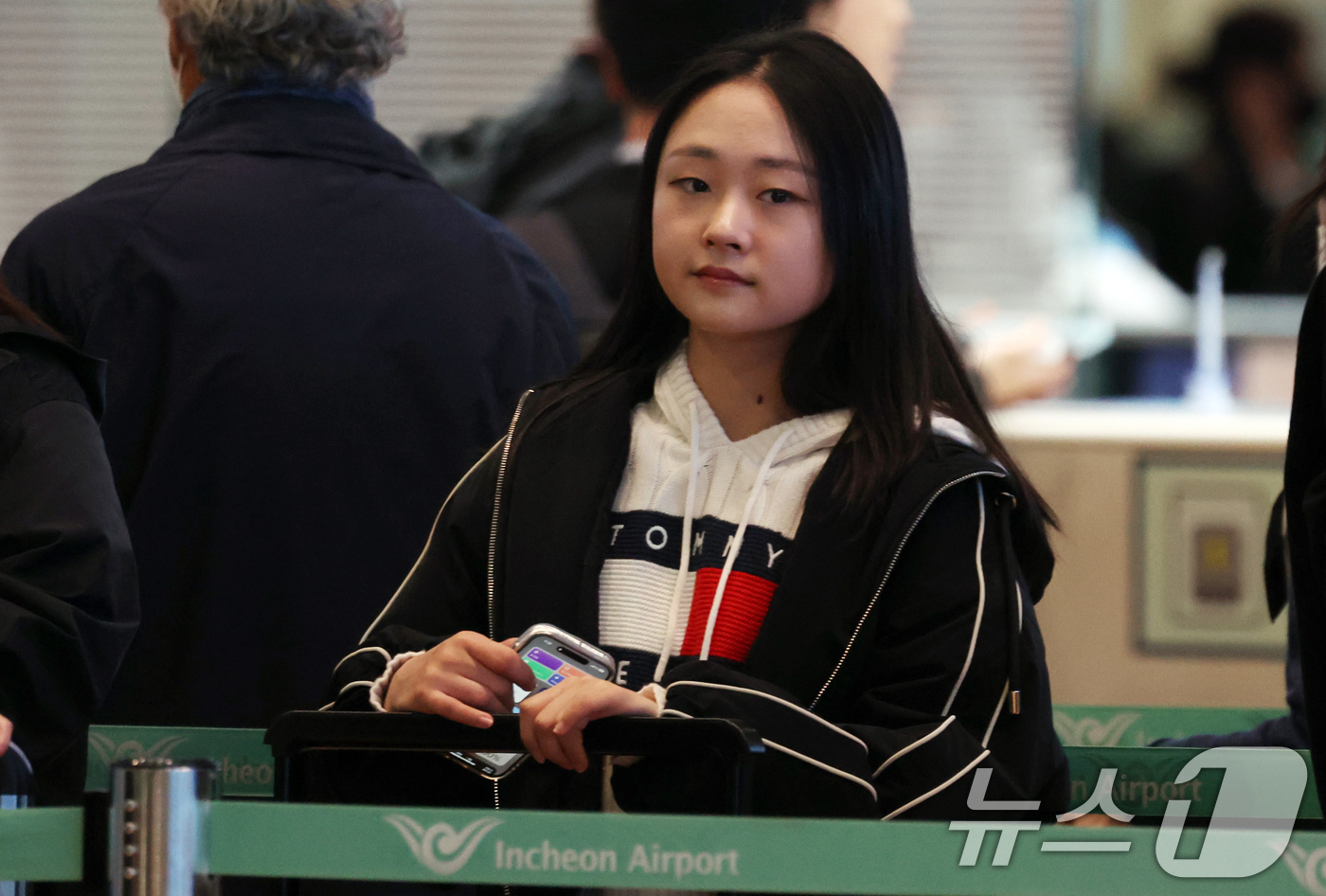 (인천=뉴스1) 김명섭 기자 = 김채연 대한민국 여자 싱글 피겨 스케이팅 국가대표가 23일 오전 인천국제공항에서 오는 25일(현지 시각) 미국 보스턴에서 개막하는 세계선수권 대회에 참가하기 위해 출국하고 있다. 2025.3.23/뉴스1