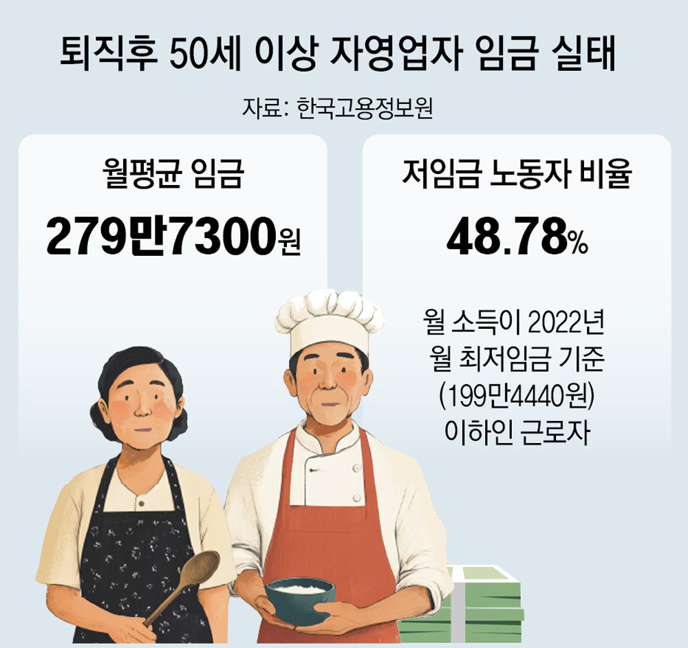 회사에서 일하다가 자영업을 하는 50세 이상의 절반가량은 월 소득이 최저임금에도 못 미치는 것으로 조사됐다. 한국고용정보원이 23일 발표한 ‘고령자의 자영업 이동과 저임금 노동’ 보고서에 따르면 회사를 퇴직하고 자영업을 하는 50세 이상의 48.78%가 최저임금보다 적은 수입을 올리는 것으로 나타났다. 이들의 월평균 소득은 279만7300원으로 집계됐다. 국세청에 따르면 2023년 기준 자영업 폐업자 수 98만5868명 중 46%가 50세 이상인 가운데 회사를 퇴직하고 제2의 인생을 꿈꾸는 고령 자영업자들이 대체로 충분한 경제적 성과를 올리지 못하고 있다는 분석이 나온다.