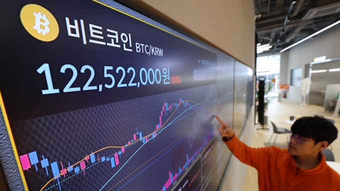 서울 서초구 빗썸라운지 전광판에 비트코인 등 가산자산 시세가 표시되고 있다. 가상자산 전문 매체 '코인데스크'는 최근 북한이 일론 머스크보다 많은 비트코인을 보유 중이라고 보도했다. /사진=뉴스1 |
