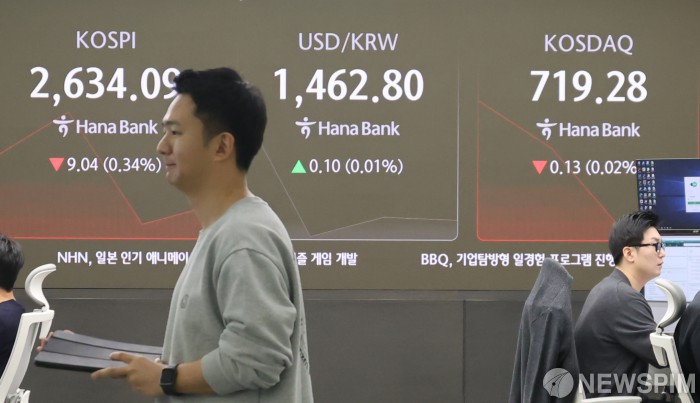 [서울=뉴스핌] 양윤모 기자 = 5년 만에 공매도 전면 재개가 일주일 앞으로 다가온 가운데, 24일 오전 코스피 지수가 전 거래일 종가보다 9.04포인트(0.34%) 내린 2,634.09로, 코스닥 지수는 0.13포인트(0.02%) 내린 719.28로 거래를 시작했다. 서울 외환시장에서 원/달러 환율은 전 거래일보다 0.10원 오른 1,462.80원에 거래되는 가운데, 서울 중구 하나은행 딜링룸에서 직원들이 업무를 보고 있다. 2025.03.24 yym58@newspim.com
