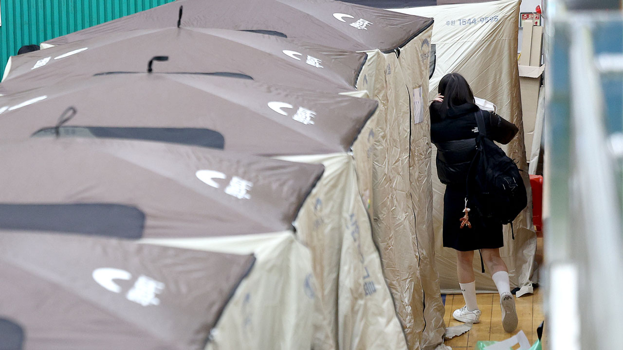 ▲ 경북 의성군 대형 산불 발생 사흘째인 24일 의성체육관에 마련된 대피소에서 한 학생이 등교하기 위해 텐트를 나서고 있다.