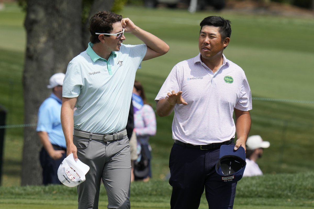 안병훈(오른쪽)이 24일 끝난 미국프로골프(PGA)투어 발스파 챔피언십에서 공동 16위를 했다. 사진은 대회 도중 동료와 이야기하는 안병훈. 팜하버=AP 뉴시스 |