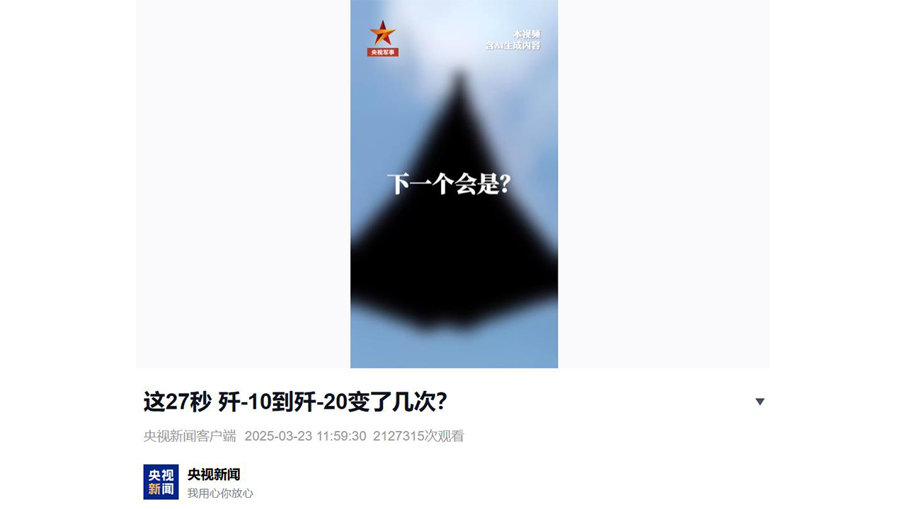 홍콩 사우스차이나모닝포스트(SCMP)에 따르면, 중국 CCTV는 어제 중국 전투기 'J-10'의 첫 비행 27주년을 기념하는 27초짜리 영상을 공개하면서 마지막에 '다음은?'이라는 문장과 함께 검은색의 흐릿한 이미지를 노출했습니다.