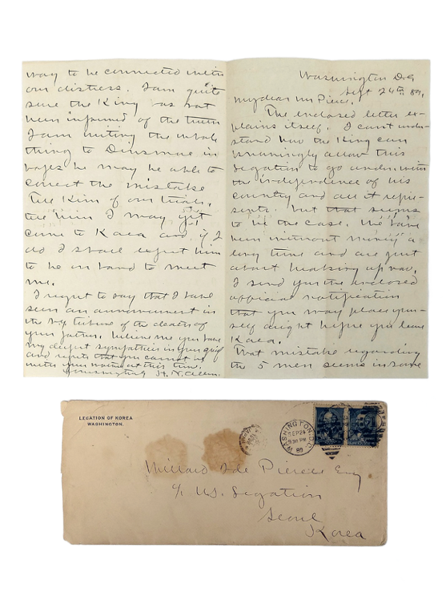 사진설명 : 고종과 운산광산 운영에 대해 언급한 알렌의 친필 편지와 봉피 |