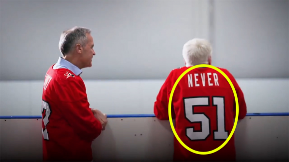마크 카니(왼쪽) 캐나다 총리가 22일(현지시간) 엑스(X·옛 트위터)에 공개한 캠페인 영상. 배우 마이크 마이어스가 입은 유니폼 뒷면에 ‘Never 51’ 문구가 적혀 있다. 엑스 MarkJCarney 캡처 |
