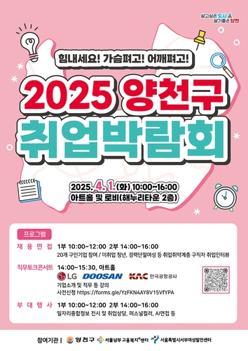 양천구(구청장 이기재)는 일하고 싶은 청년·중장년에게 다양한 취업 기회를 제공하기 위해 '2025 취업박람회'를 다음 달 1일 양천해누리타운 2층에서 개최한다고 25일 밝혔다.