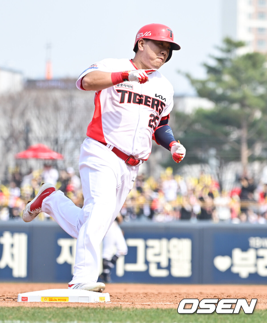[OSEN=광주, 조은정 기자]23일 광주KIA챔피언스필드에서 2025 신한 SOL Bank KBO리그 KIA 타이거즈와 NC 다이노스의 경기가 열렸다.홈팀 KIA는 양현종을, 원정팀 NC는 라일리를 선발 투수로 내세웠다.2회말 무사 1루 KIA 이우성이 동점 중월 2점 홈런을 날린 뒤 베이스를 돌고 있다. 2025.03.23 /cej@osen.co.kr |