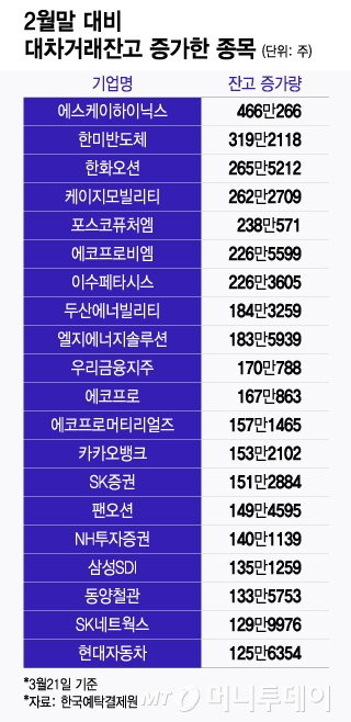 머니투데이가 지난 2월28일부터 이달 21일까지 예탁결제원 대차거래잔고 자료를 분석한 결과에 따르면 이 기간에 대차거래잔고가 가장 많이 증가한 종목은 SK하이닉스다.