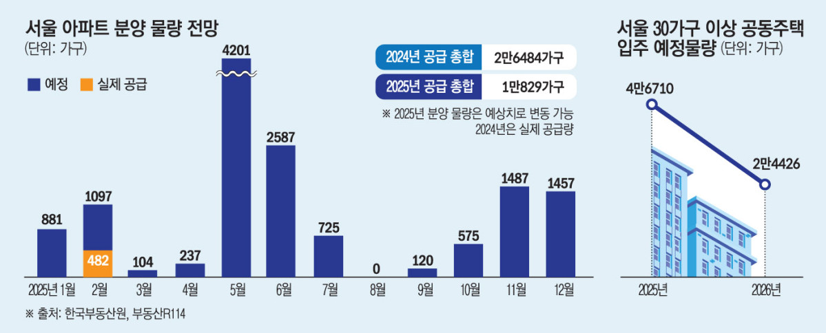 25일 부동산R114 통계 분석 결과 올해 서울 분양 예정 물량은 1만829가구로 조사됐다. 지난해 서울의 실제 분양 물량은 2만6484가구였던 것과 비교하면 59.1%(1만5655가구) 급감했다.