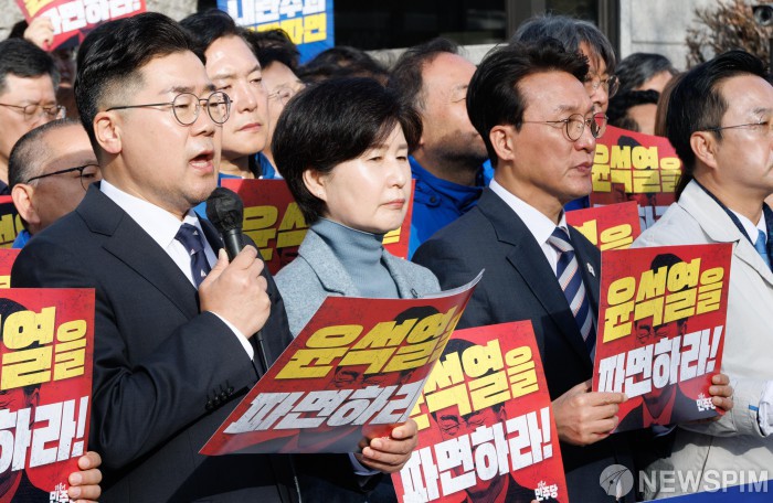 [서울=뉴스핌] 윤창빈 기자 = 박찬대 더불어민주당 원내대표가 26일 오전 서울 종로구 헌법재판소 앞에서 열린 내란수괴 윤석열 신속파면 촉구 더불어민주당 기자회견에서 기자회견문 낭독을 하고 있다. 2025.03.26 pangbin@newspim.com