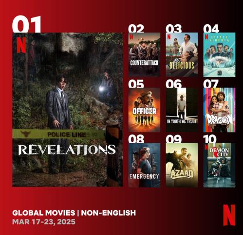 26일 넷플릭스 공식 사이트인 '넷플릭스 톱 10'에 따르면 3월 17∼23일 일주일간 영화 '계시록'의 시청 수(시청 시간을 상영 시간으로 나눈 값)는 570만으로 집계돼 넷플릭스 비영어 영화 시청 1위에 올랐다.