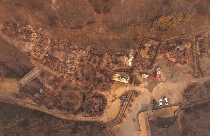 26일 대형 산불로 전소 피해를 입은 경북 의성군 단촌면 고운사 일대에 사찰 잔해만 남아있다. /사진=뉴시스 |