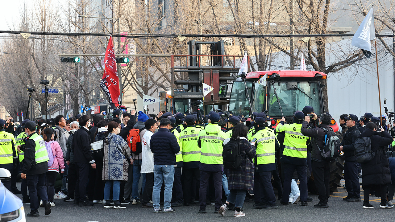 ▲ 26일 서울 종로구 자하문로에서 경찰들이 전국농민회총연맹(전농) 소속 트랙터를 둘러싸고 있는 가운데 시민단체 회원들과 대치하고 있다.