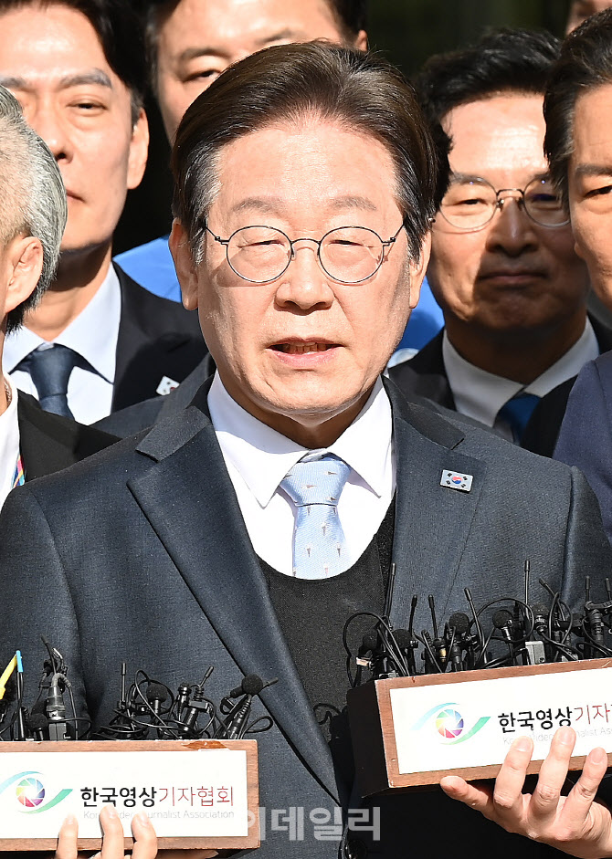 [사진공동취재단] 이재명 더불어민주당 대표가 26일 서울 서초구 서울고등법원에서 열린 공직선거법 위반 사건의 항소심 선고를 마치고 나온 뒤 입장을 밝히고 있다. |