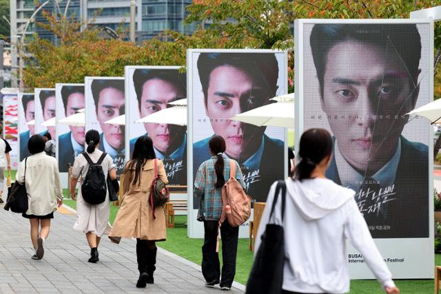 지난해 제29회 부산국제영화제 기간 시민들이 OTT 티빙 드라마 '좋거나 나쁜 동재' 광고판 옆을 지나고 있다. 지난해 부산영화제는 집행위원장 공석에 따라 직무대행 체제로 치러졌다. 부산=뉴시스 |