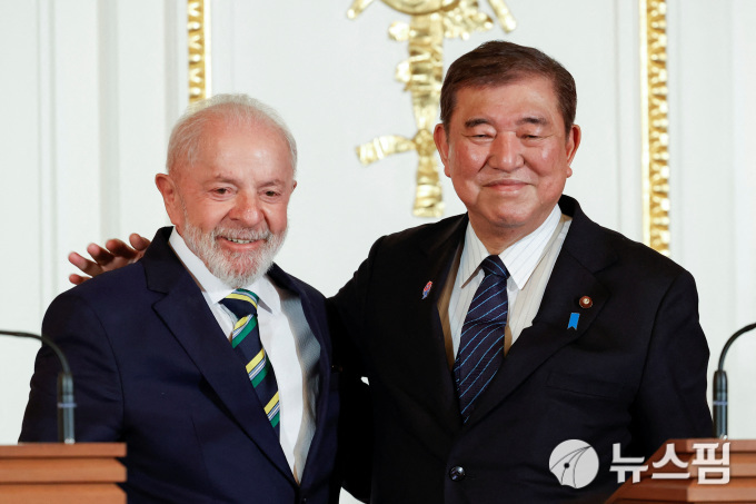 정상회담 후 기자회견에서 다정하게 포즈를 취하고 있는 룰라 브라질 대통령(왼쪽)과 이시바 일본 총리 [사진=로이터 뉴스핌] |