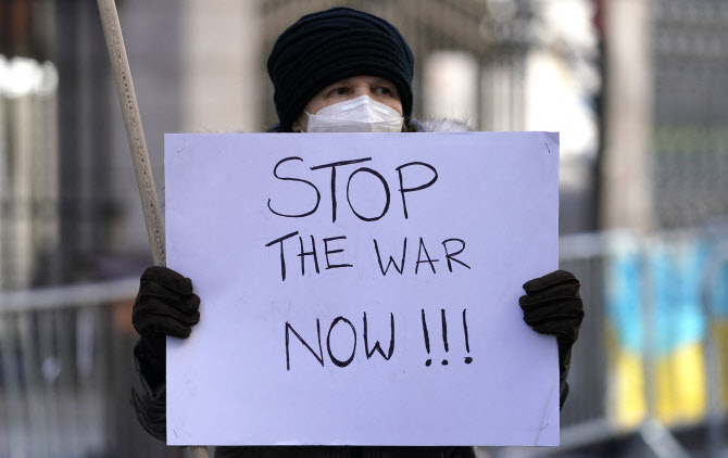 친우크라이나 시위대가 2021년 3월 4일 뉴욕에 있는 러시아 총영사관 앞에서 시위를 벌이고 있다. (사진=AFP) |