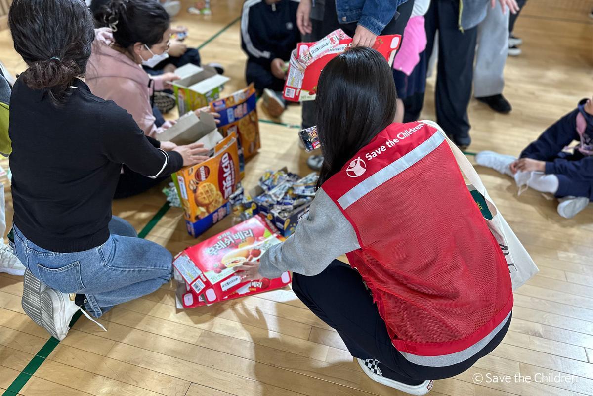 울산 산불 피해 지역 임시대피소에서 지원 물품을 전달하고 있는 세이브더칠드런 직원. 세이브더칠드런 제공 |