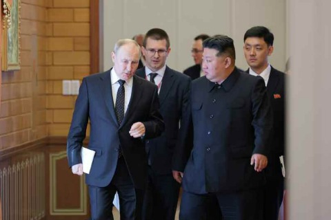 2024년 6월19일 북한 평양을 방문한 블라디미르 푸틴 러시아 대통령(왼쪽)이 김정은 북한 노동당 총비서와 대화하고 있다. /평양 노동신문=뉴스1 |
