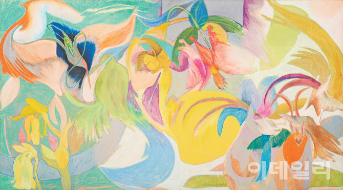 최욱경의 ‘미처 못 끝낸 이야기’(1977). 1970년대 작품세계에 쌓아올리던 강렬한 원색의 대비 대신 파스텔톤 색채로 화면의 변화를 꾀했다. 폭 266㎝에 달하는 거대한 화면에는 춤추듯 부드럽게 유영하는 형체들이 서로 겹치기도, 부딪히기도 하며 자리를 잡아가는 중이다. 5월 1일 국립현대미술관 서울에서 개막하는 ‘MMCA 서울 상설전: 한국현대미술 하이라이트’에 걸린다. 한지에 색연필·크레용, 147×266㎝. 국립현대미술관 소장. |