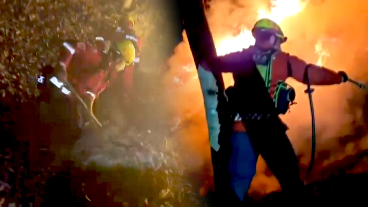 시뻘건 불길을 앞에 두고 진화대원 두 명이 무릎 넘게 쌓인 낙엽을 걷어냅니다.