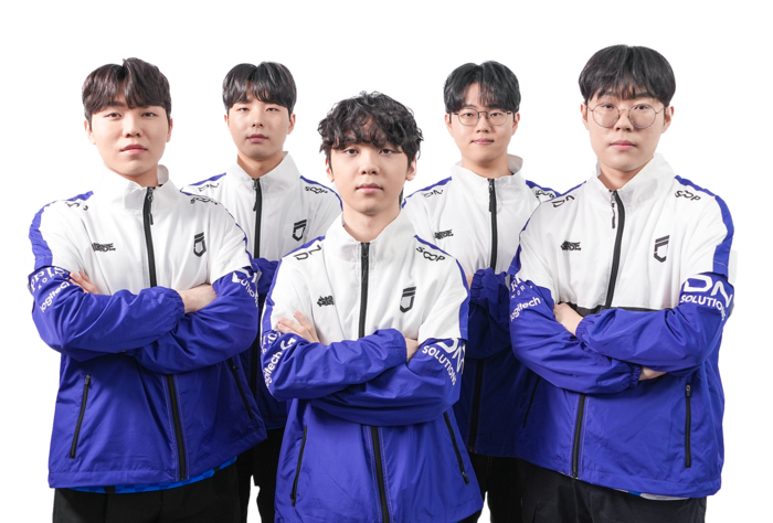 DN프릭스 ‘헤븐’ 김태성 ‘디엘’ 김진현 ‘규민’ 심규민 ‘살루트’ 우제현 ‘플리케’ 김성민 감독. 사진 | 크래프톤 |